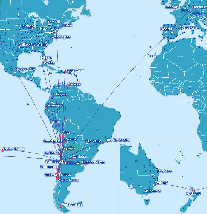 Rotas aéreas das capitais pelo mundo para Santiago. Uma observação disponibilizada pela LAN Airlines é que a rota Santiago-Arica iniciou suas operações em 5 de março de 1929